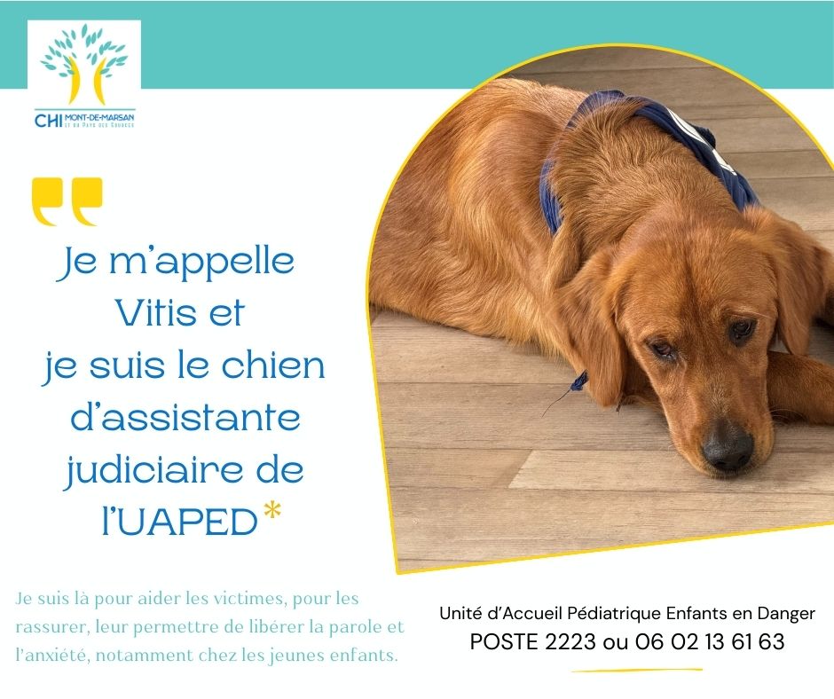 La visite de Mr Eric Tuffery, Procureur Général de la cour d’appel de Pau, et de Mme Alexa Dubourg, Procureur du tribunal de Mont de Marsan, au sein du Service d’Accueil des Victimes, aura été l’occasion de présenter officiellement Vitis, le chien de soutien émotionnel aux victimes mineurs du CHI Mont de Marsan.