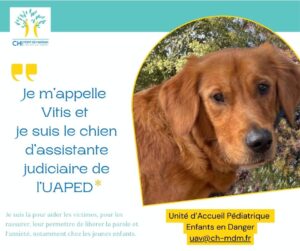 Depuis octobre 2025, le service a accueilli un nouveau collègue à 4 pattes nommé Vitis. Vitis est le chien de soutien émotionnel aux victimes mineurs du CHI Mont de Marsan.